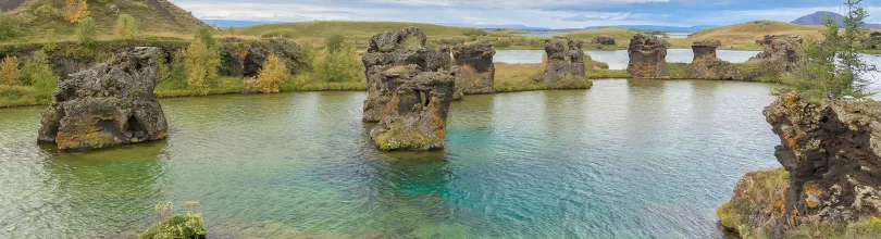 Fra Akureyri passerer I vandfaldet Godafoss på vej til søen Mývatn. Mývatn er en utrolig spændende region, så brug gerne en ekstra time her, for at nå at se det hele. Her er fantastiske vulkanske formationer, geotermisk aktivitet og et rigt fugleliv. Start med at udforske de vulkanlignende kratere ved Skútustadir, og fortsæt derefter gennem en labyrint af mærkelige lavaformationer ved Dimmuborgir.